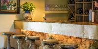 Un bar à vin est situé dans un salon avec cheminée.